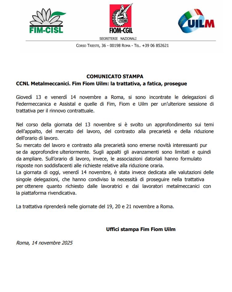 COMUNICATO STAMPA CCNL Metalmeccanici. Fim Fiom Uilm: la trattativa, a fatica, prosegue Giovedì 13 e venerdì 14 novembre a Roma, si sono incontrate le delegazioni di Federmeccanica e Assistal e quelle di Fim, Fiom e Uilm per un’ulteriore sessione di trattativa per il rinnovo contrattuale. Nel corso della giornata del 13 novembre si è svolto un approfondimento sui temi dell’appalto, …
