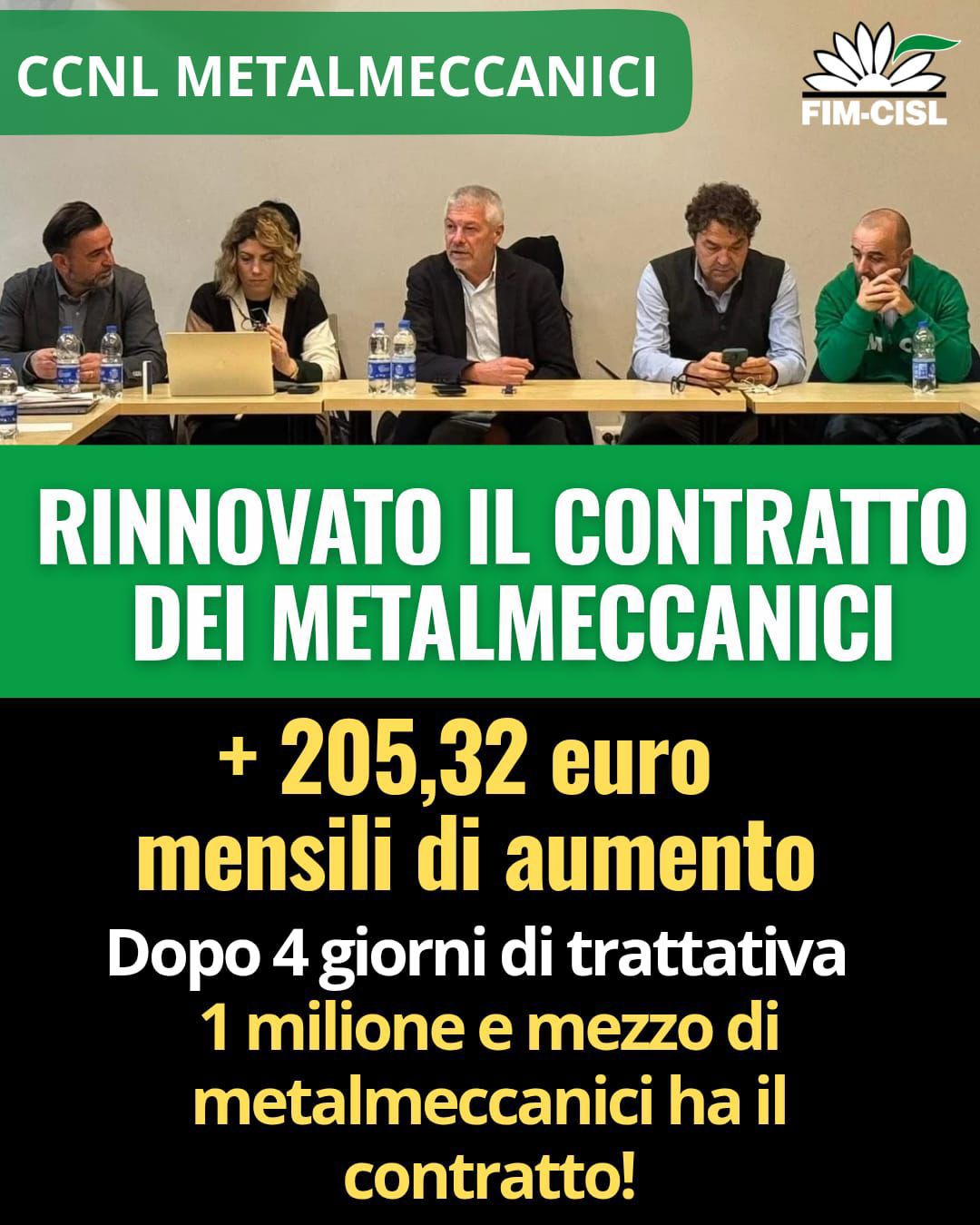 Dichiarazione del Segretario Generale Fim-Cisl Ferdinando Uliano Contratto Metalmeccanici: +205,32 € al mese (+9,64%) Aumenti superiori all’inflazione Ipca. Miglioramenti su welfare, orario, sicurezza, precarietà e diritti. Un rinnovo importante per oltre 1,5 milioni di metalmeccanici Dopo quattro giorni di intenso negoziato, nel tardo pomeriggio del 22 novembre 2025 è stato firmato il rinnovo del CCNL Metalmeccanici 2025–2028. L’aumento salariale medio …