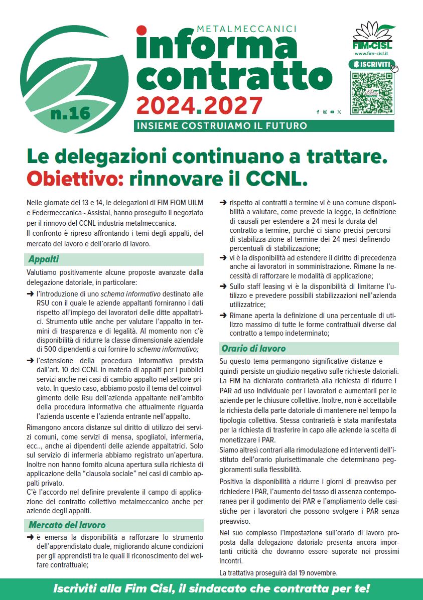 COMUNICATO STAMPA CCNL Metalmeccanici. Fim Fiom Uilm: la trattativa, a fatica, prosegue Giovedì 13 e venerdì 14 novembre a Roma, si sono incontrate le delegazioni di Federmeccanica e Assistal e quelle di Fim, Fiom e Uilm per un’ulteriore sessione di trattativa per il rinnovo contrattuale. Nel corso della giornata del 13 novembre si è svolto un approfondimento sui temi dell’appalto, …
